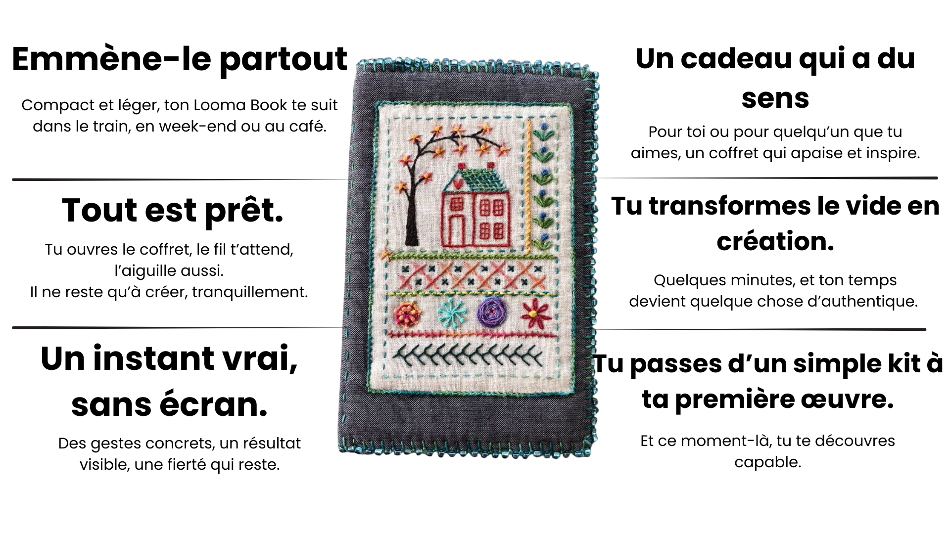 - Dimensions – 15 × 18 cm | Inclus : carnet, kit de couture et e-book Looma.